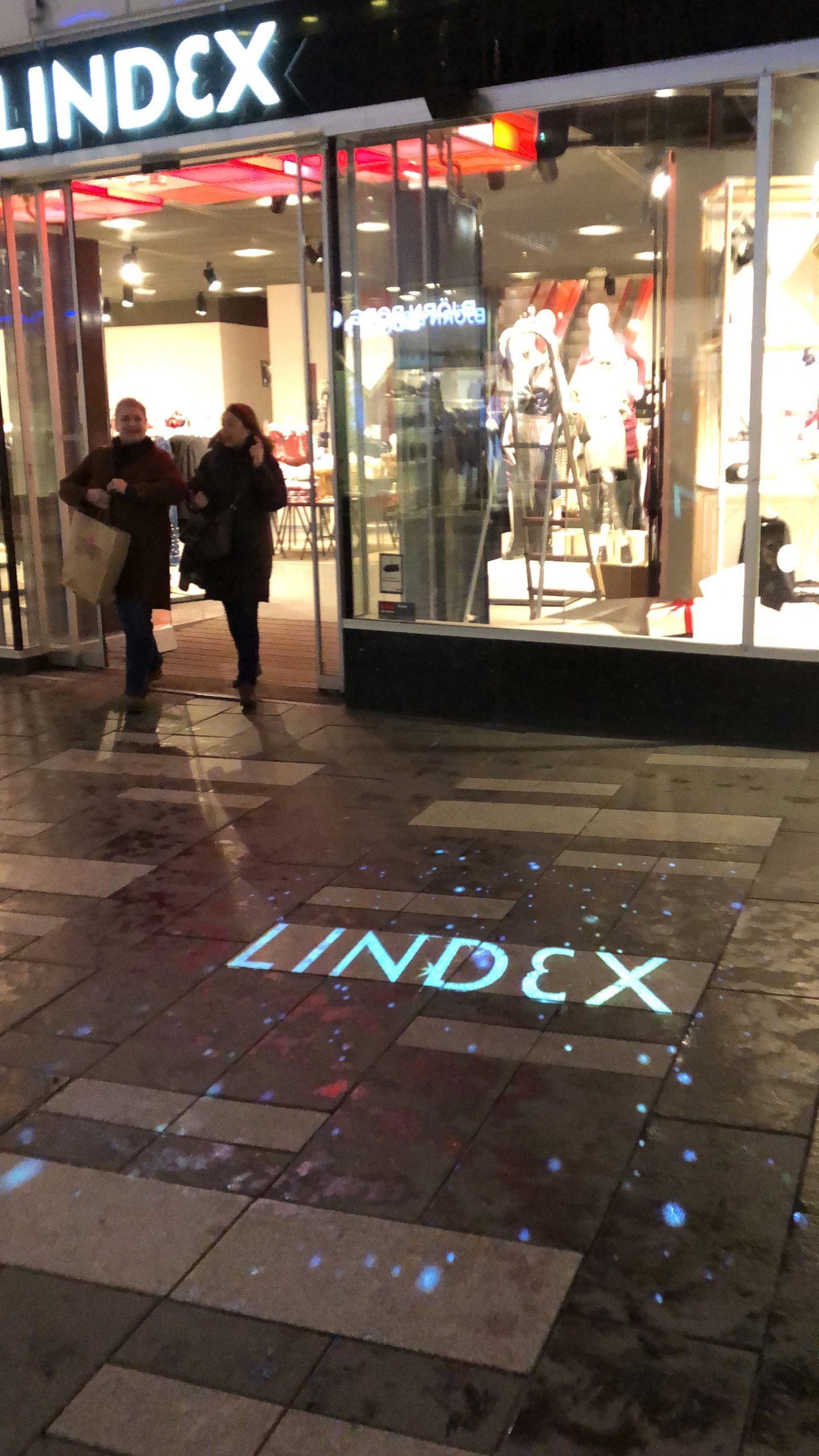 Trottoarprojektorn presenterar Loggor, erbjudanden, reklam, vägledning och underhållning med större genomslagskraft än traditionell skyltning förmår.